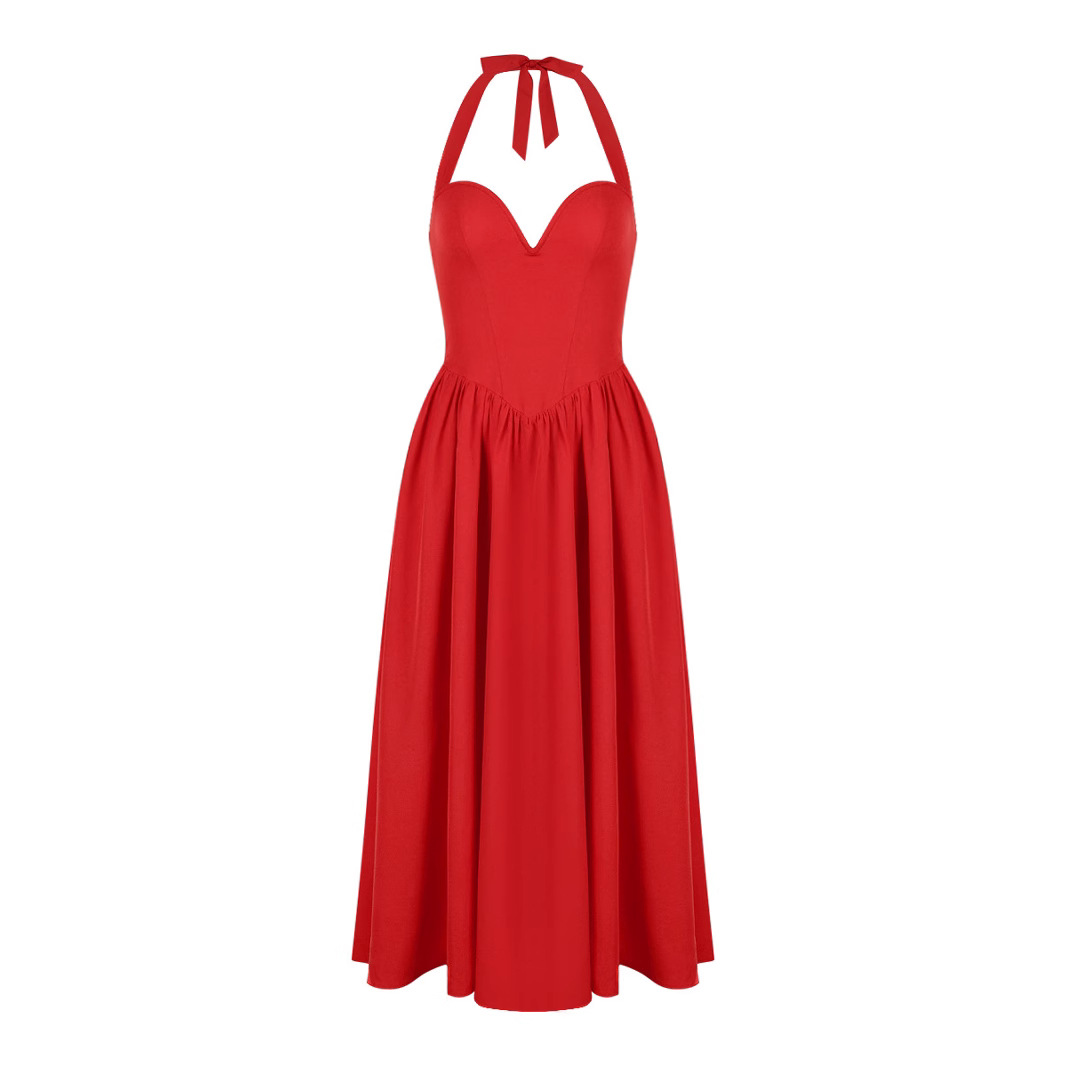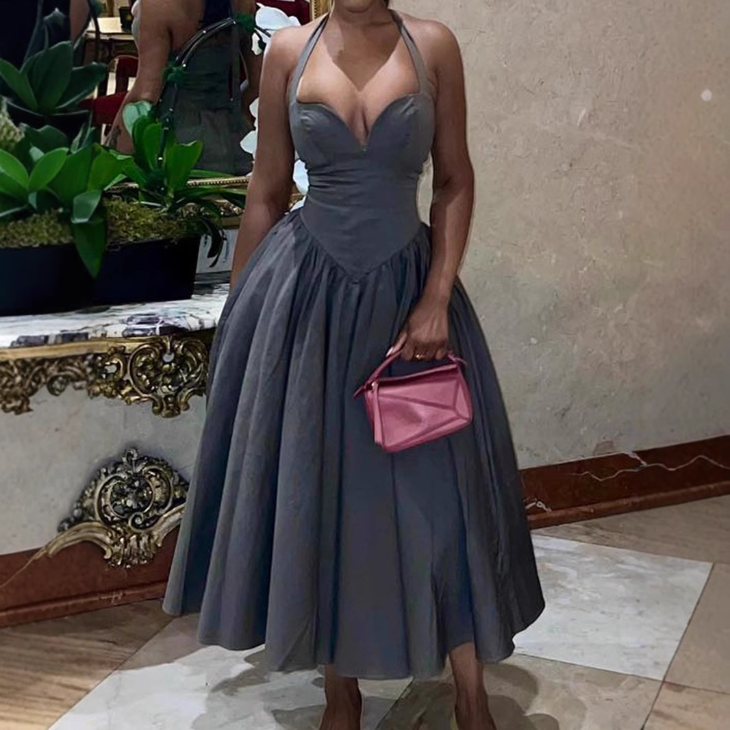 Make a bold statement with this stunning deep V halter midi dress, designed to accentuate your curves with a fitted bodice and a flowy A-line skirt. The plunging neckline enhances femininity, while the halter tie design adds an elegant touch, perfect for formal events, romantic evenings, or special occasions. Featuring a backless silhouette, this dress exudes confidence and sophistication. The fully lined construction ensures comfort while maintaining a sleek, structured look. Available in red and gray, this piece is a must-have for a chic and high-fashion wardrobe.