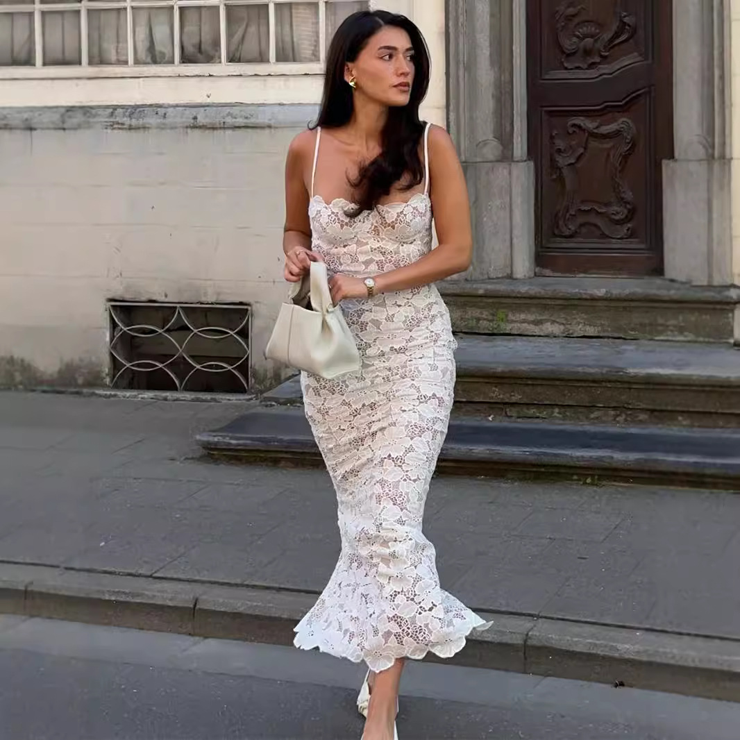 Step into elegance with this stunning lace mermaid dress, designed for a flattering body-hugging fit. Featuring delicate floral lace, a scalloped bustline, and a sophisticated backless design, this dress exudes romantic charm and luxury. The built-in padding and full lining provide both support and comfort, while the subtle slit adds a touch of drama. Perfect for formal events, weddings, or glamorous evening occasions, this dress is a must-have for those who love sophisticated and feminine fashion.
