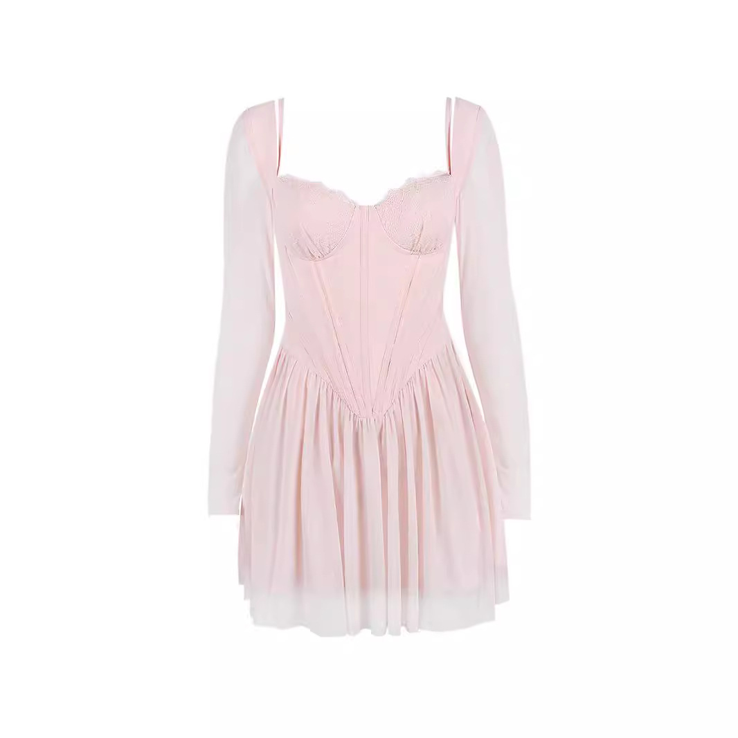 Channel your inner Barbiecore elegance with this stunning corset mini dress, designed with delicate lace, sheer mesh sleeves, and a structured boned bodice for the perfect snatched waist effect. The built-in padded cups enhance your curves, while the flowy tulle skirt adds a dreamy, fairy-like touch. Whether you’re dressing up for a party, date night, or a stylish cosplay look, this dress blends romantic femininity with bold sophistication. Fully lined for comfort and available in a soft pink hue, it’s a must-have for chic fashion lovers.
