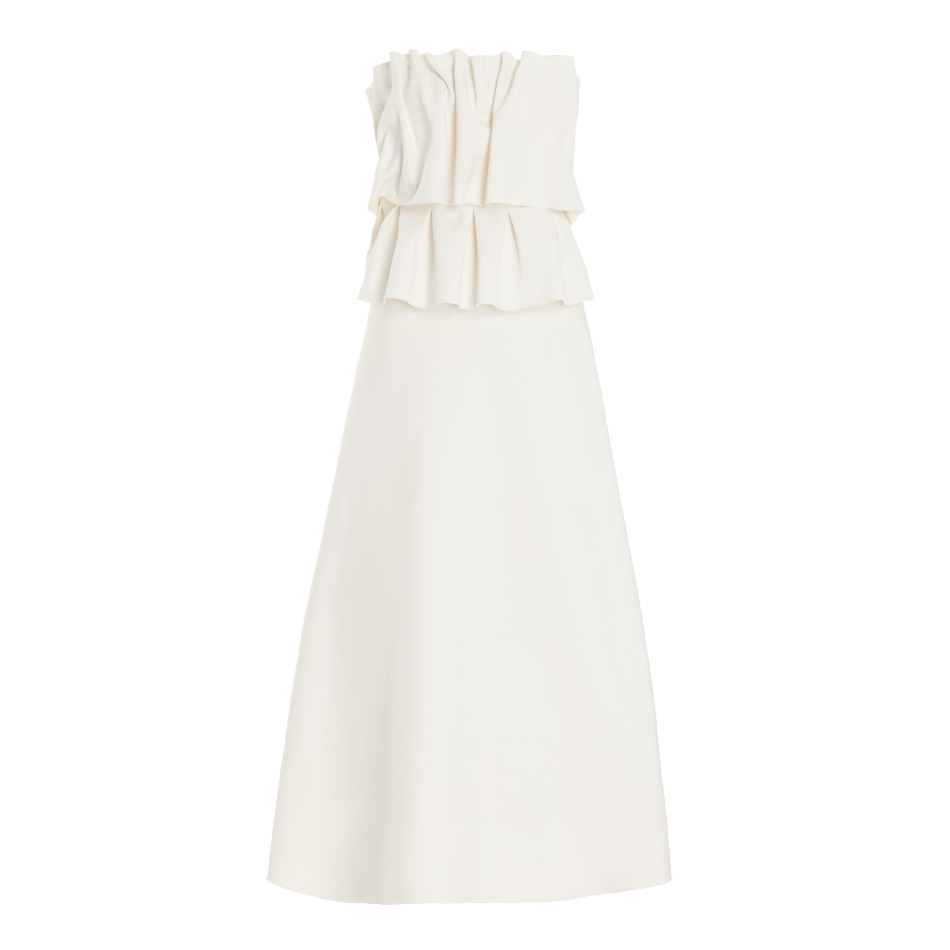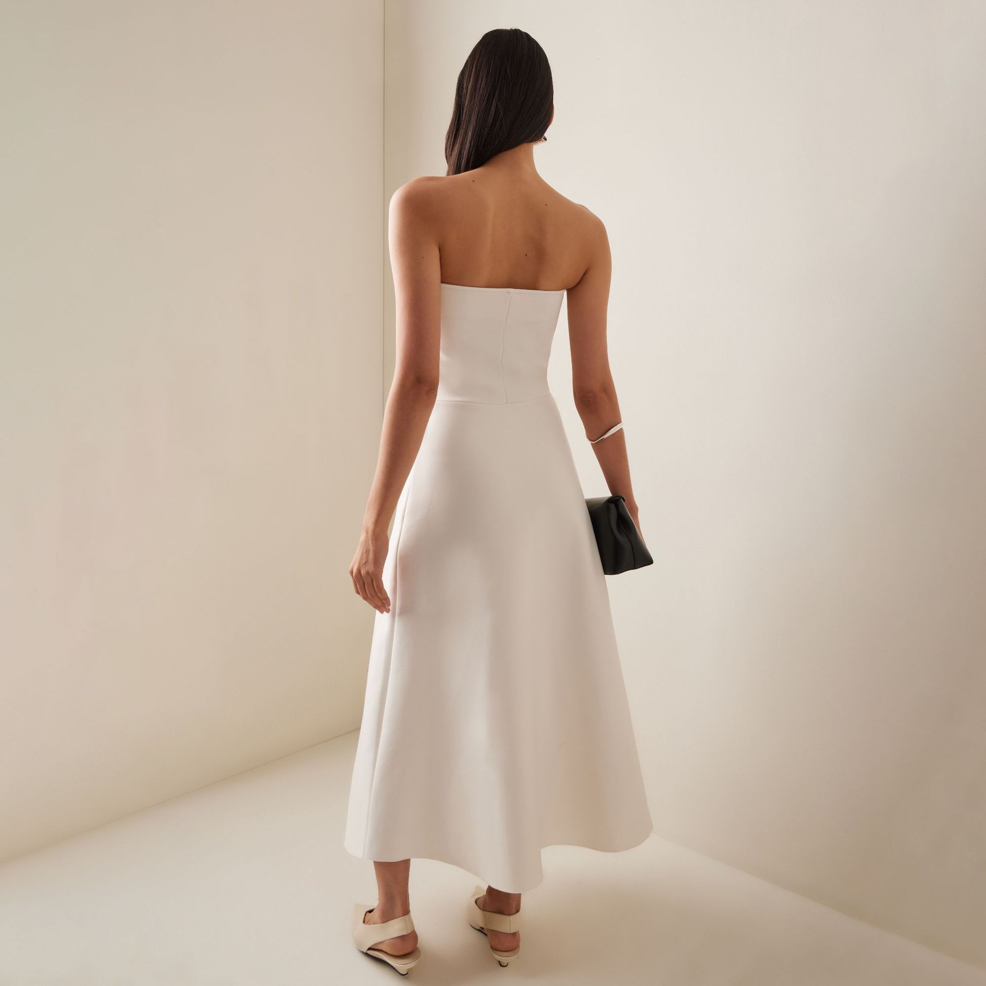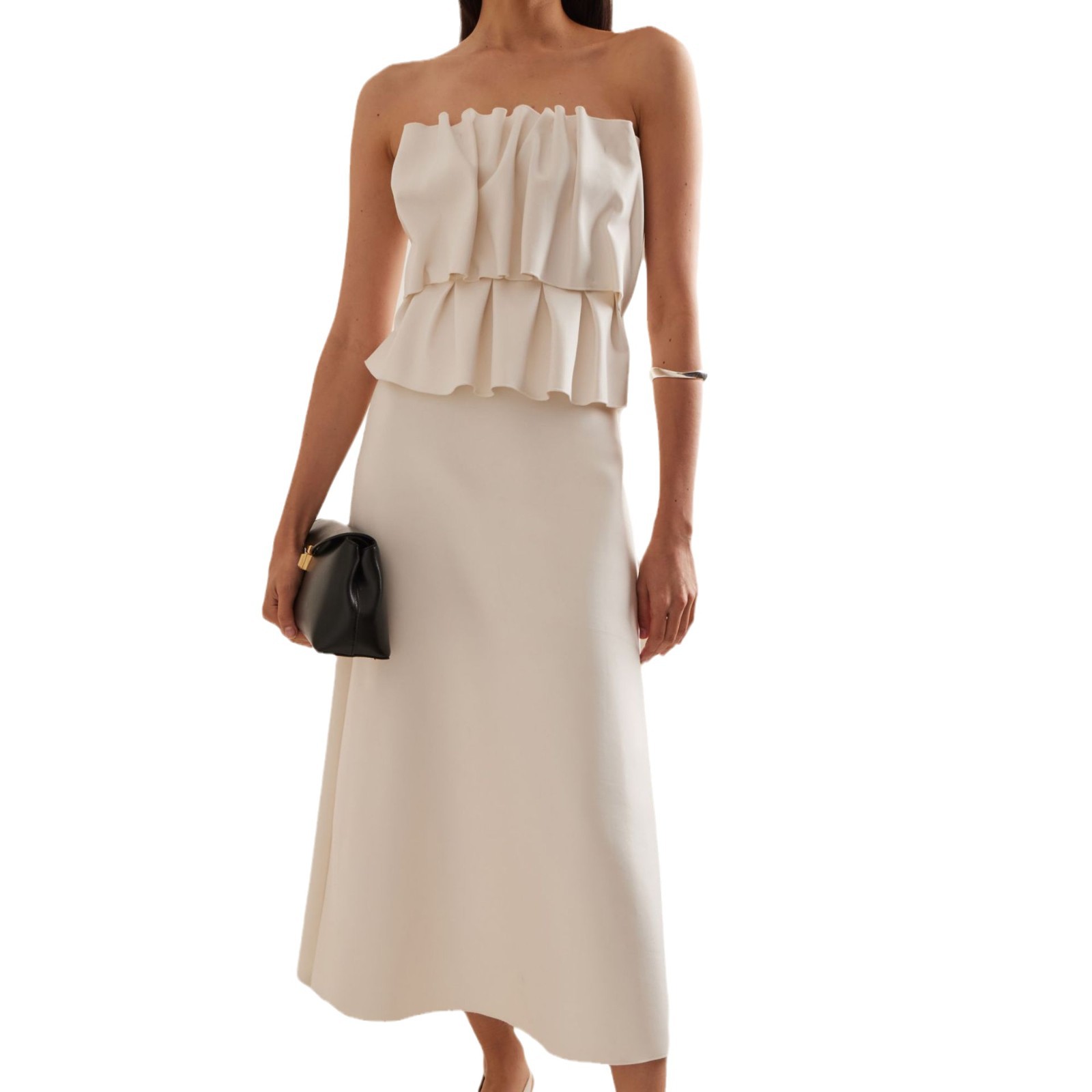 Add a touch of timeless elegance to your wardrobe with this white ruffled midi dress. The strapless design and delicate pleated ruffles at the bust offer a sophisticated, yet playful look, while the smooth fabric creates a flattering silhouette. This dress is perfect for romantic evenings, cocktail parties, or any special occasion where you want to feel chic and graceful. The French-inspired design brings an air of refinement, making it an elegant choice for those who love subtle beauty.