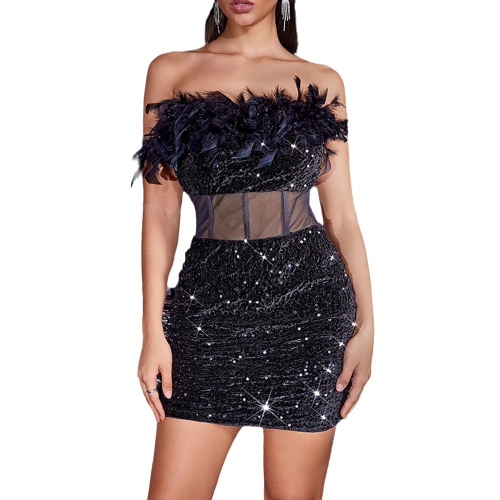 Step into the spotlight with this luxurious strapless mini dress, featuring shimmering sequins, a sheer corset waist, and dramatic feather details. The bodycon fit enhances your curves, making it a stunning choice for parties, cocktail nights, and red-carpet events. Pair it with statement earrings and high heels for an ultra-glamorous look!