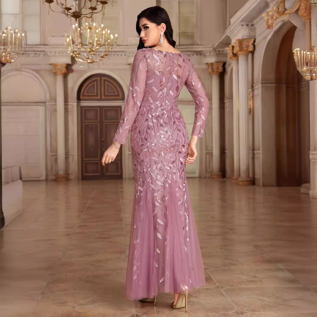 Feel confident and elegant in this plus-size evening gown with stunning floral embroidery. This long-sleeve dress features a flattering V-neck design and a back zipper closure for a secure fit. The beautiful fish-tail silhouette enhances your curves, while the full lining ensures comfort all night. Perfect for weddings, parties, or any formal event, this dress combines timeless elegance with a modern twist. Available in various sizes, this dress is a true wardrobe staple.