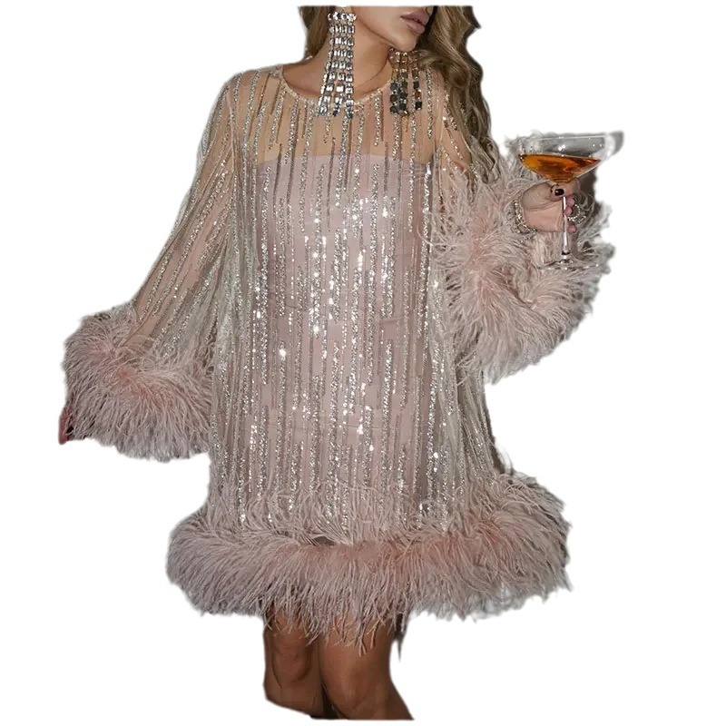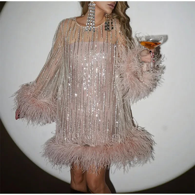 Dazzle the night away in this sequin feather mini dress, designed for bold elegance. The sheer overlay with shimmering embellishments creates a dreamy, ethereal effect, while the bell sleeves adorned with ostrich feathers add a touch of vintage glamour. Perfect for high-end parties, red carpet events, and unforgettable nights, this dress ensures all eyes are on you. Feel confident, stylish, and effortlessly chic in this luxurious statement piece.