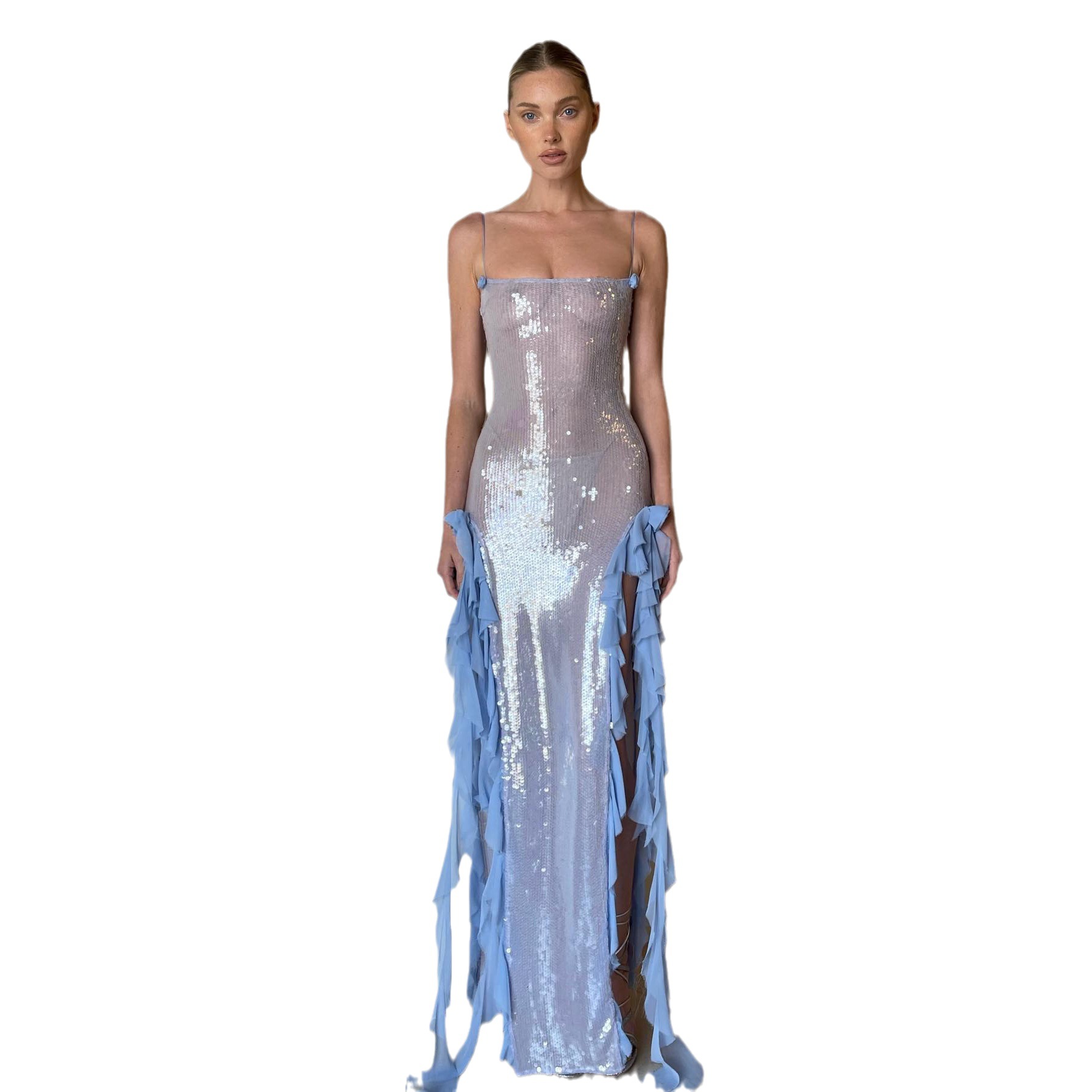 Shine in this sequin ruffle maxi dress, a perfect blend of elegance and allure. The sheer design subtly enhances your curves, while delicate spaghetti straps highlight your shoulders and neckline. Flowing ruffle details add a dreamy touch, making every step graceful. Whether for a party, gala, or evening event, this dress ensures you radiate confidence and charm effortlessly.