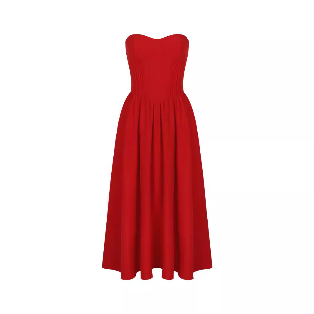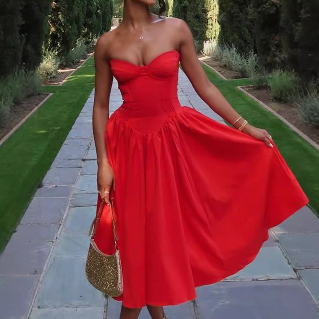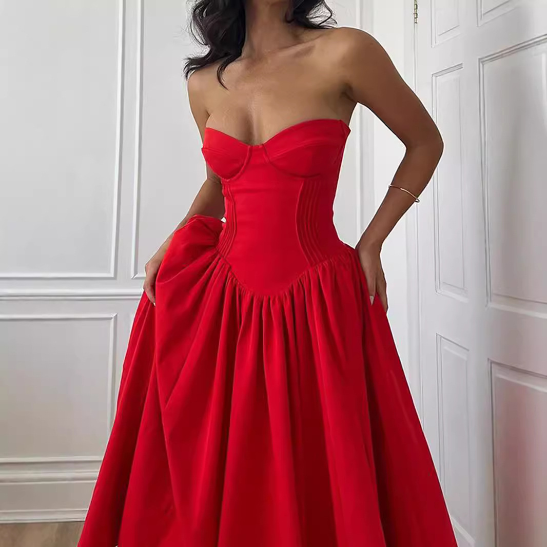 Step into timeless elegance with this strapless corset midi dress, featuring a structured bodice with built-in padding for the perfect shape and support. The snatched waistline and voluminous flared skirt create a stunning hourglass silhouette, while the backless design adds a touch of sultry sophistication. Fully lined for comfort, this dress is perfect for date nights, special events, and elegant evening outings. A must-have for those who love chic and feminine fashion.